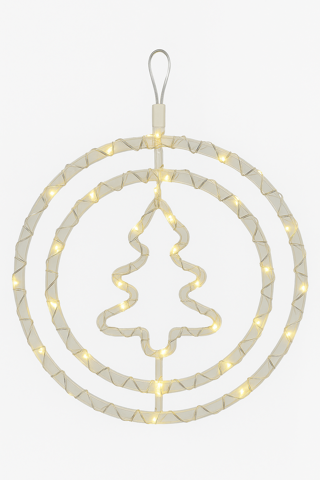 Sumá un toque moderno y luminoso a tu decoración con este colgante LED en forma de arbolito dentro de aro doble. Su estructura acrílica transparente potencia el brillo del blanco cálido, creando un efecto suave, elegante y súper cozy que se ve increíble tanto de día como de noche.