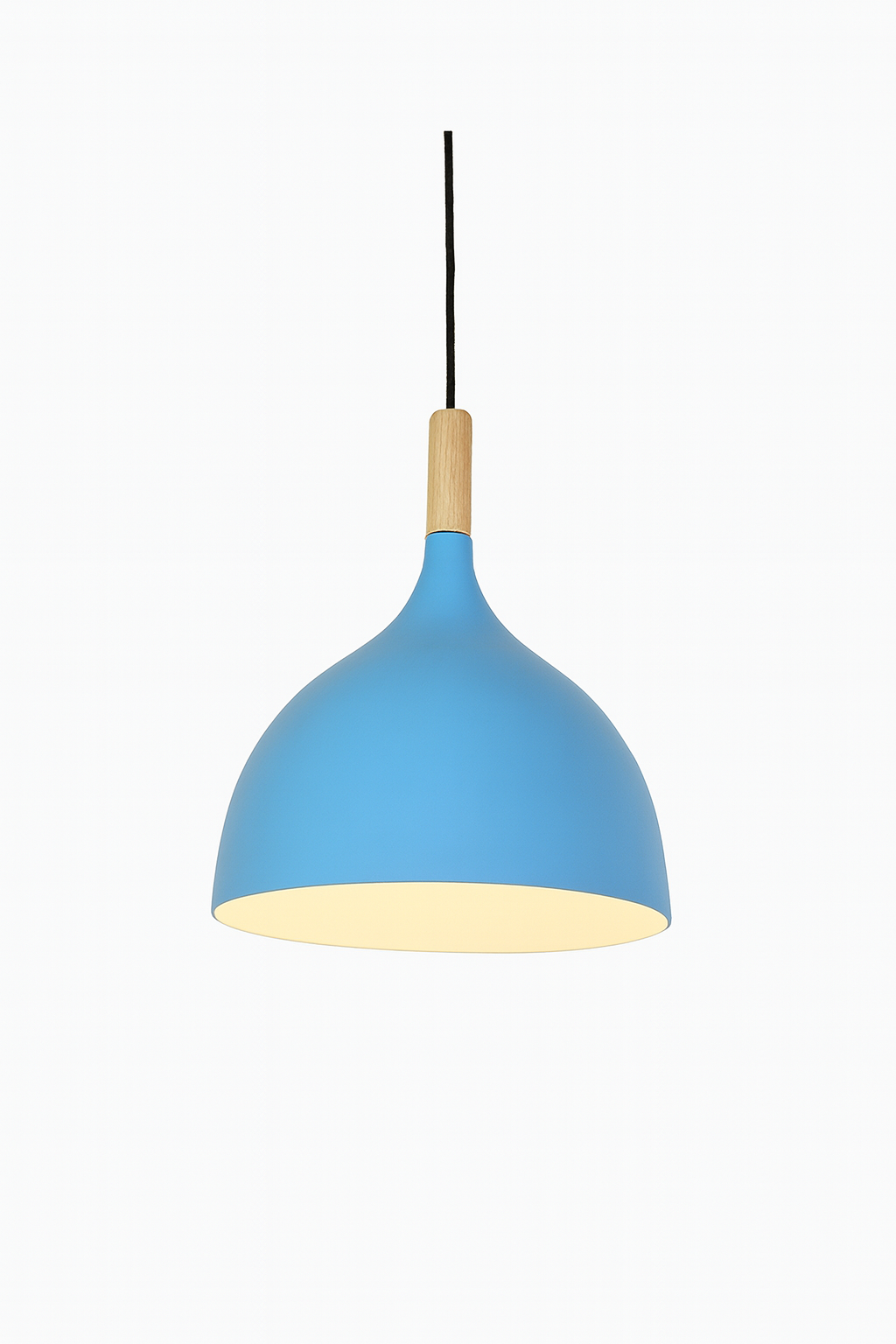 El Colgante Nórdico Oslo combina un diseño minimalista con un toque fresco y actual. Su pantalla en azul matte aporta color sin saturar, mientras que el detalle en madera natural suma calidez y textura al ambiente.