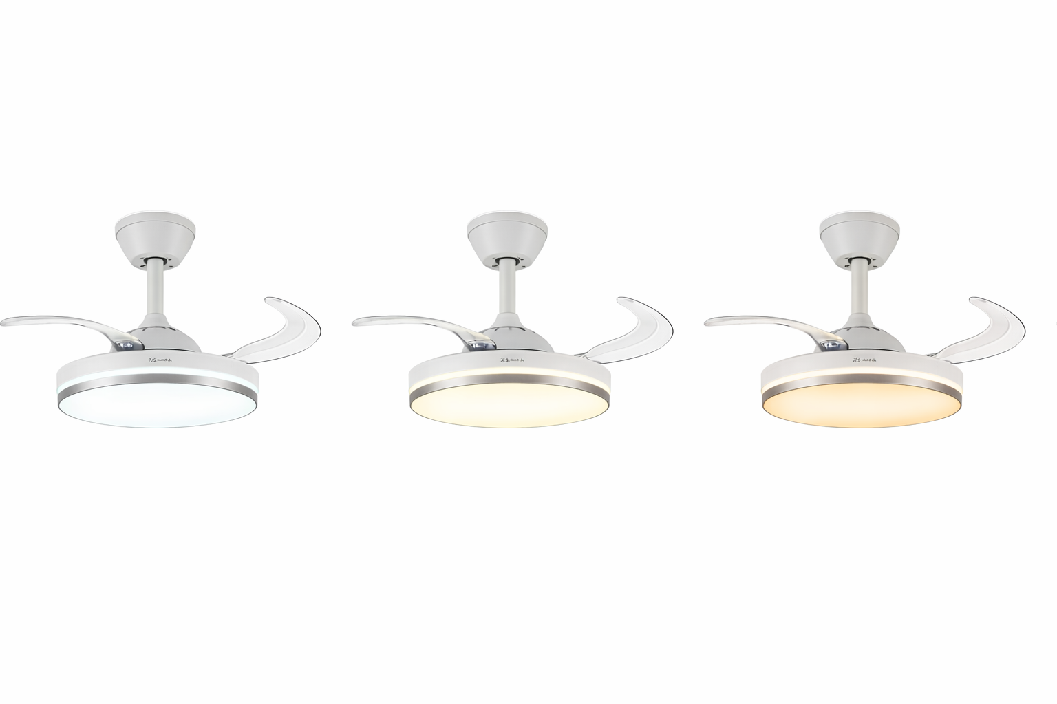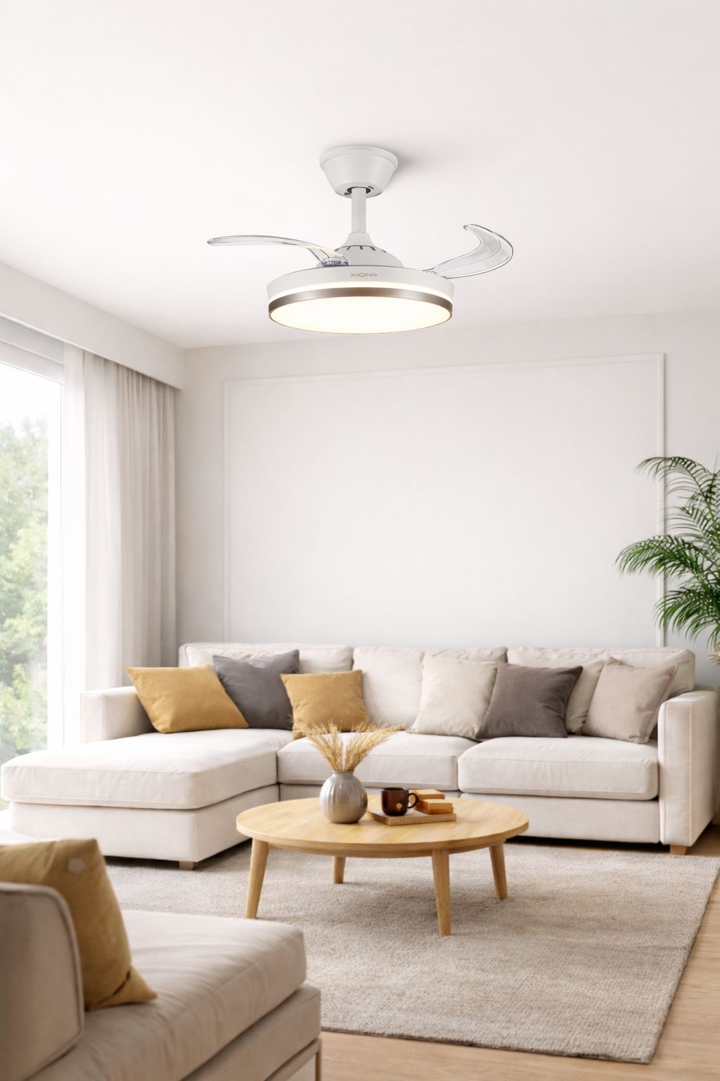 Este ventilador de techo con luz LED integrada es una solución práctica y estética para quienes buscan climatización e iluminación en un solo producto. Su diseño moderno incorpora aspas retráctiles transparentes, que se despliegan únicamente durante el uso del ventilador, manteniendo una apariencia limpia y minimalista cuando está apagado.